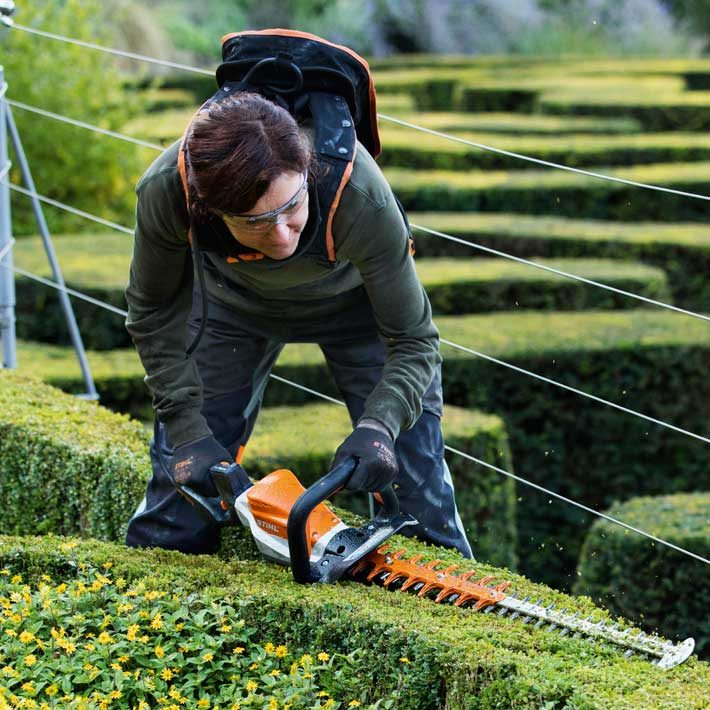 Extrem leistungsstarke, robuste Profi-Akku-Heckenschere mit hoher Messergeschwindigkeit für präzise Schnitte. Konstante Hub zahl auch unter Last, drehbarer Multifunktionsgriff mit dreistufig einstellbarer Hubzahl, doppelseitig geschliffene Messer in Trimmschnittausführung, aufgeschraubter Schnitt- und Führungsschutz. Akku-Betrieb mithilfe der Gürteltasche AP mit Anschlussleitung oder dem Tragsystem.